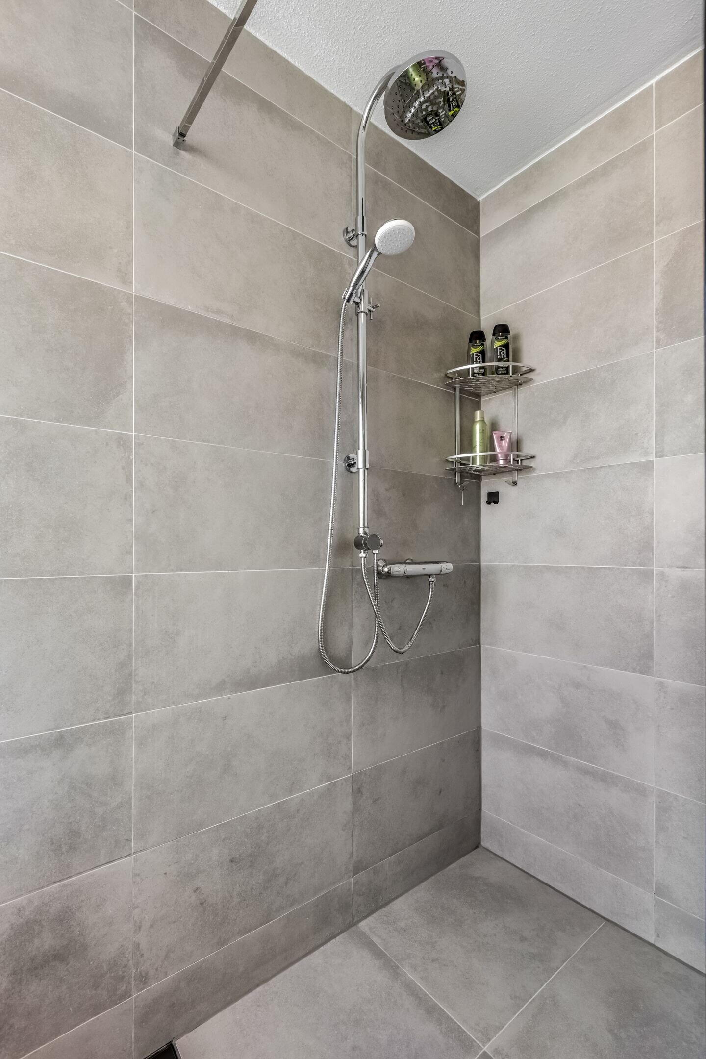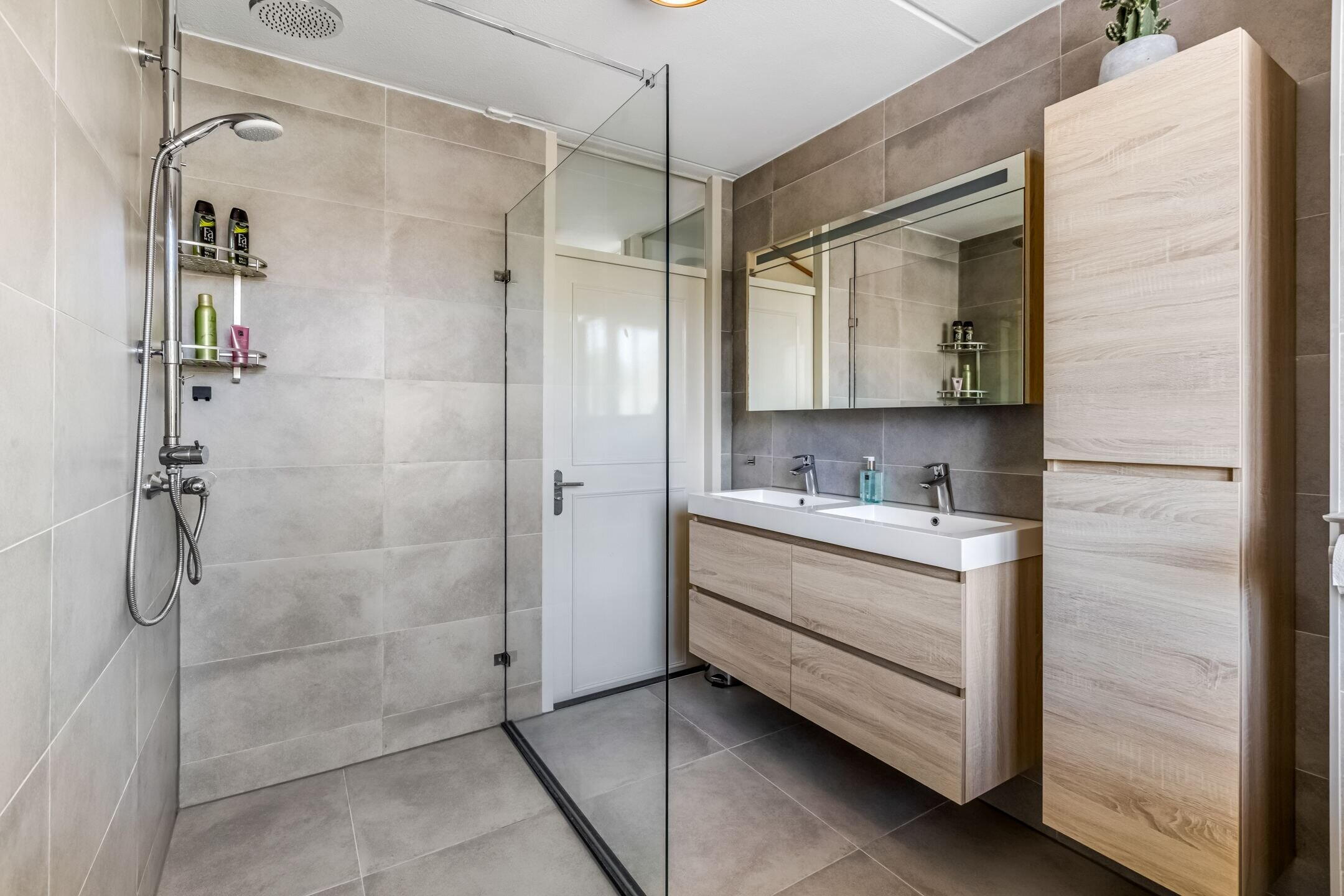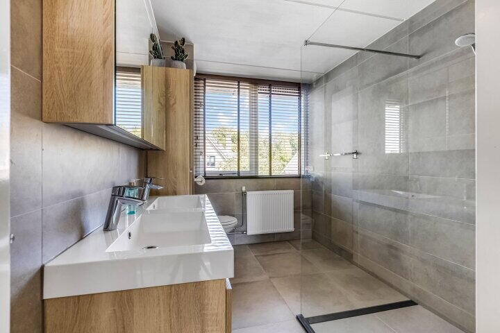 - Dubbele wastafel, inloopdouche, toilet, en wastafelmeubel